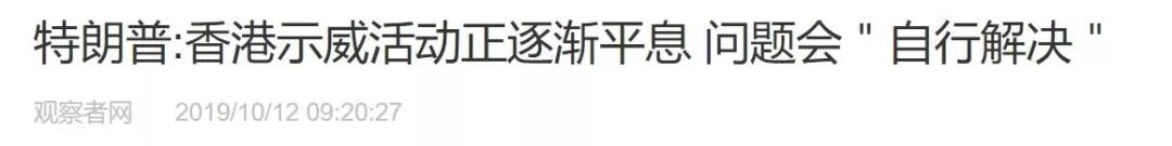10月份特朗普再次就香港问题表态时,他说中国已经在香港事务上取得了巨大进展,示威人数也越来越少,问题会“自行解决”。