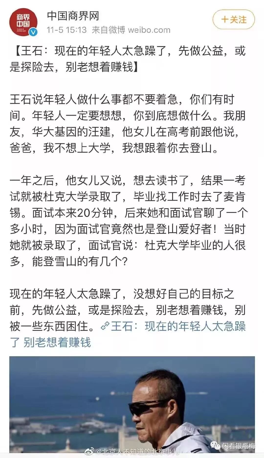 当然,他还举例了。他朋友的女儿高考前突然不上大学了,跟着父亲爬山。爬了几年后,觉得还是读书好玩。于是重新回到了学校,并考上了杜克大学。她考上杜克大学的原因是,因为她有登山的经验……