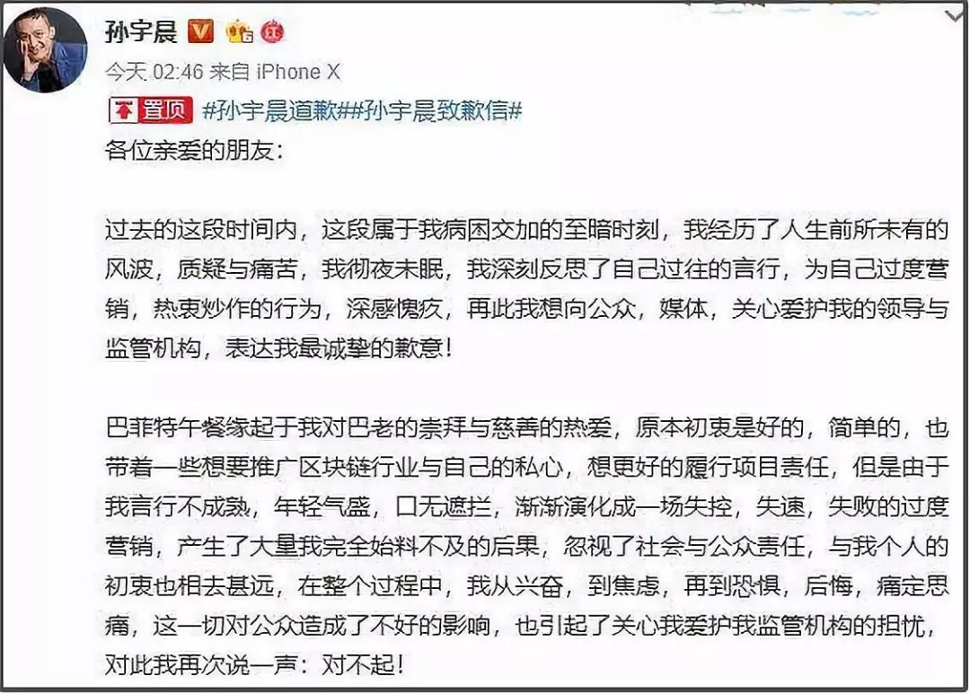 7月25日,孙宇晨发布了一封致歉信,试图公关,可惜如今已经没有人相信他。