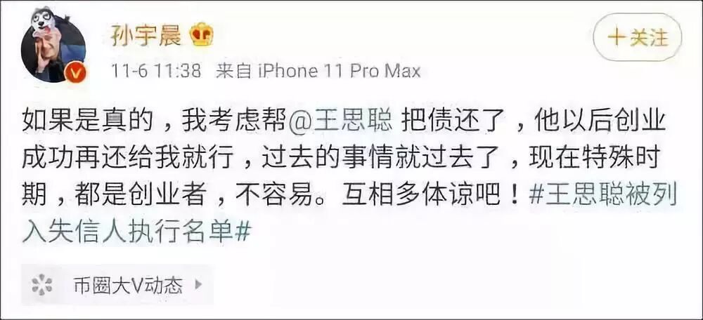 孙宇晨第一时间声援,称“师兄要是愿意,这公司我先投1000万,祝您第三春百花齐放”。