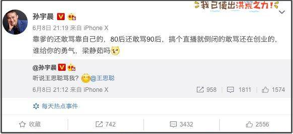 孙宇晨怼王思聪:“80 后,敢骂 90 后?”“靠爹的,敢骂靠自己的?”“搞直播就倒闭的,还敢骂还在创业的?” “梁静茹给你的勇气吗?”
