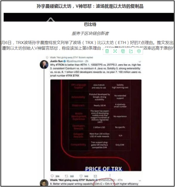 为了炒作,他还在推特上发了7条波场优于以太坊的理由。结果被对方揪出在他发行的波场币白皮书中,有多达 9 页的地方是抄他们的。