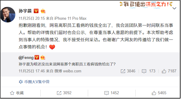 11月25日,网易暴力裁员事件在网络上引发巨大震动,听到动静,孙宇晨自然不会放过。立马在微博炒作,说网易职工看病的钱他要全出。