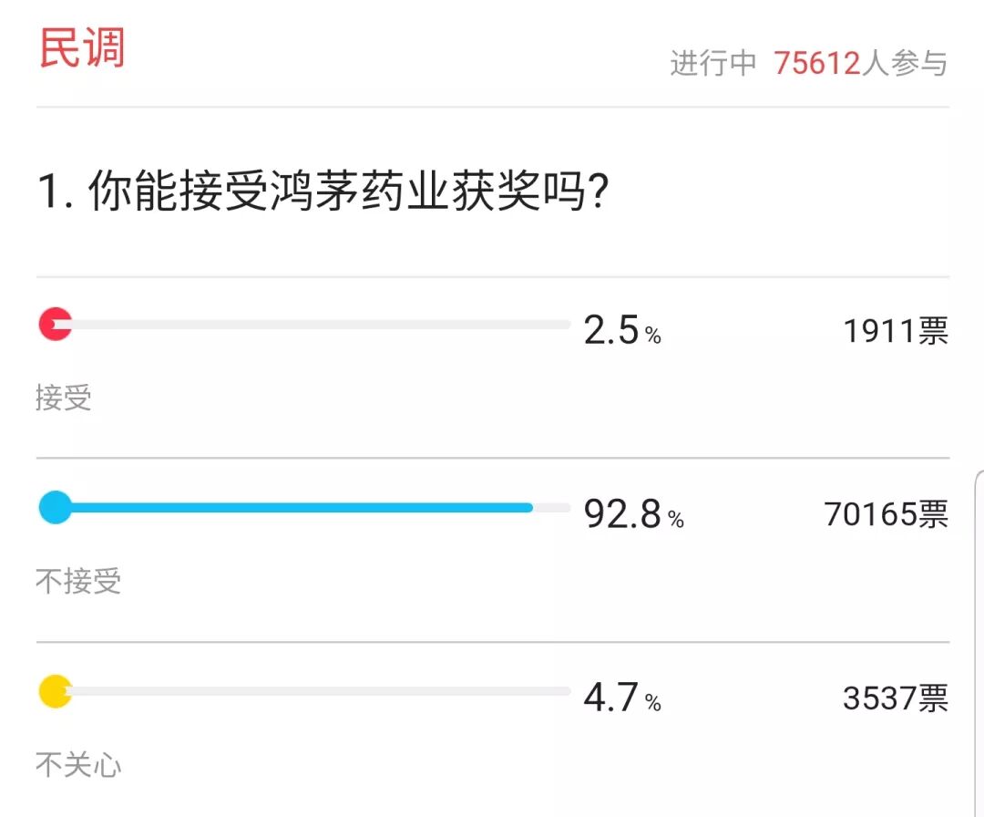 而在凤凰网发起的“你能接受鸿茅药业获奖吗?”的投票中,截至今天晚上6点40分,超过90%的网友都选择了不接受。