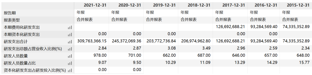 公司不算是研发驱动型企业,但是研发投入也不低。2021年达到了3.1亿元,研发支出占营业收入的比例约2.84%。