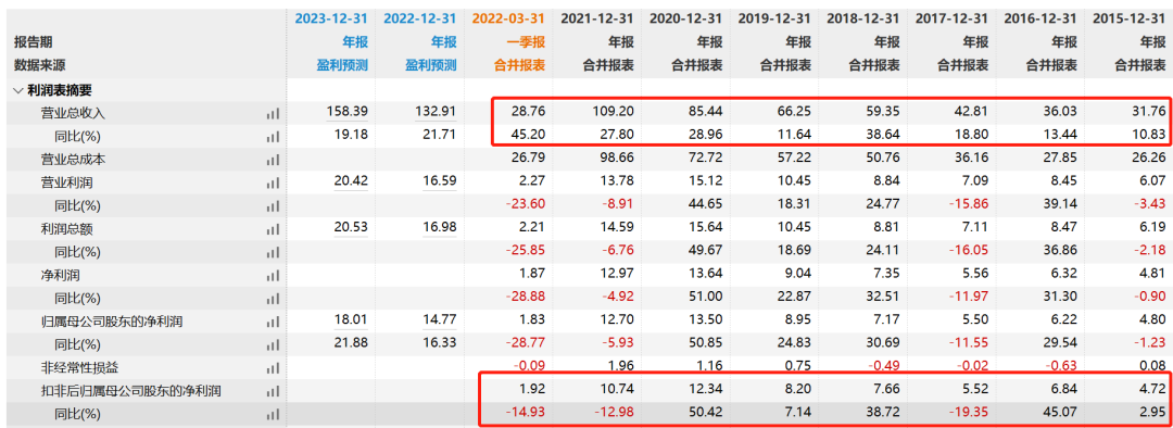 拉长周期看,公司过去几年收入增长很不错,由2015年的32亿增加至2021年的109亿元,但是扣非净利润波动较大,2015年4.72亿元,2021年约11亿元。