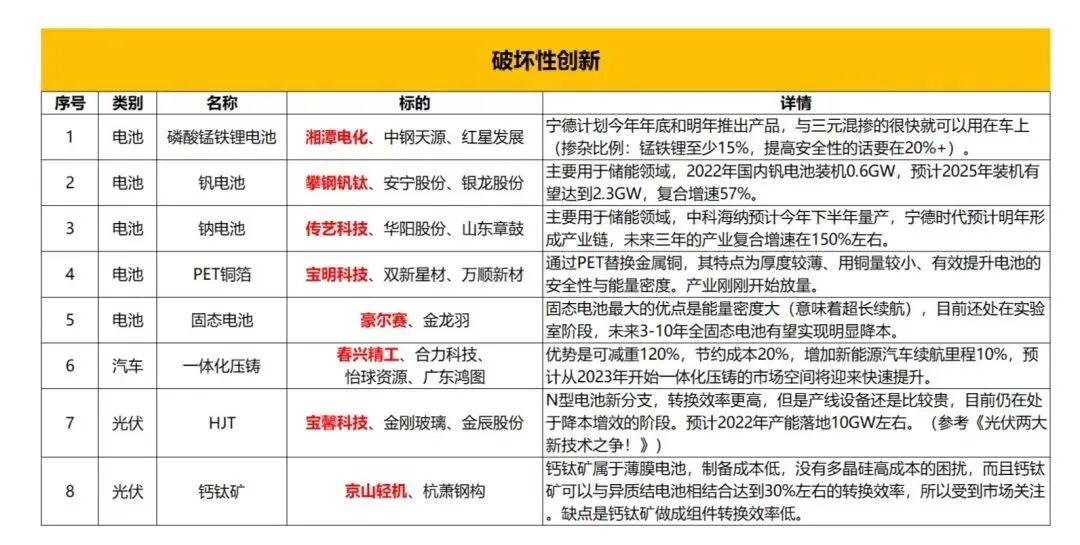 答案很简单,主要是新型电池钒电池、钠电池、麒麟电池,新型电池材料PET铜箔等,光伏的新型路线HJT、TOPcon、钙钛矿等,新能源汽车的一体化压铸、空气悬架等等。