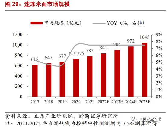 所以虽然都是冻品行业,细分行业并不相同。根据Frost&Sullivan数据,2021年我国速冻火锅料市场规模约520亿元,2020年之前都维持着10%以上的增长,属于增速非常优秀的赛道,属于成长期的赛道。同时看未来的话,市场给的预期还是很高的,预计2021-2025年复合增速超过10%,当然,我觉得这个很难,大概率达不到这么高的增速。