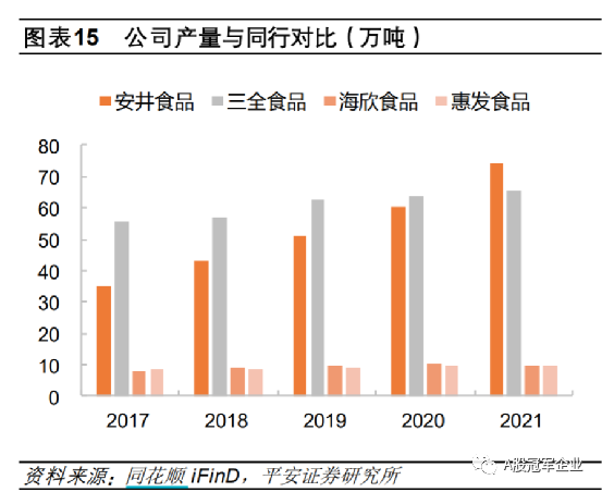 安井食品的成长离不开产能的扩张,2013年公司产量超过海欣食品和惠发食品,2021年超过三全食品成为行业第一,2021年产量约为74万吨。从产量增长来看,安井食品远超其他三家公司。