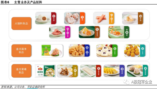安井食品核心业务是速冻火锅料制品,包括速冻鱼糜制品和速冻肉制品,火锅料制品包括包馅类、丸类、片类仿蟹类、油炸类、肠类、烧烤类等,这些是安井食品的核心业务。此外还有速冻面米制品和速冻菜肴制品(预制菜)。