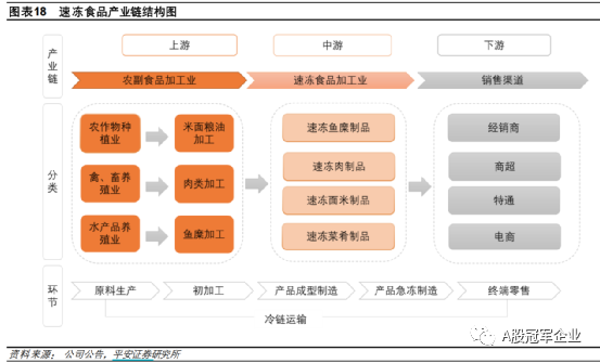 速冻产业链很简单,上游是农副食品加工业,包括米面粮油、肉、鱼等,中游就是我们分析的行业,下游就是销售渠道,可以分为B端、C端,也可以分为线上、线下,但是不管怎么分,最终都是被大家消费了。