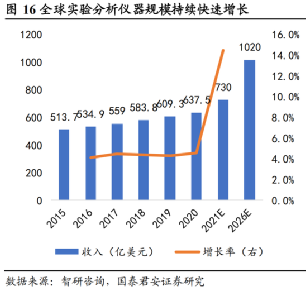 因此,生命科学仪器是国家重点支持发展的领域,已经被列为十四五规划重点支持产业之一。国泰君安证券估计,自2021年起,得益于全球研发投资的快速增长,全球实验分析仪器规模的增长率也将加快,预计2026年规模将达到1020亿美元。