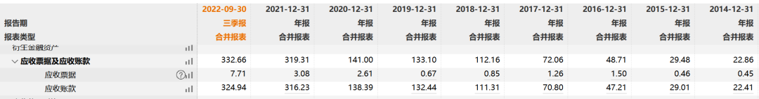 歌尔声学2019年至2021年经营现金流分别为55亿、77亿和86亿,这个经营现金流好转并非是收回客户的回款增加,也是压榨上游欠款带来的,这三年应付账款分别增加了43亿、80亿和51亿。体现在资产负债表上,应付账款从2015年的26亿增加至2022年Q3的300亿。