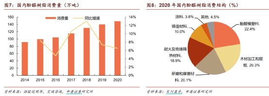 酚醛树脂行业并不大,2020年国内酚醛树脂表观消费量约150万吨,过去五年复合增长率约8.4%。从应用领域来看,酚醛模塑料、层压板和摩擦材料等为主要应用领域,占比超过60%。其中作为铸造材料增长较快,铸造材料下游其实就是以风电等行业为主。