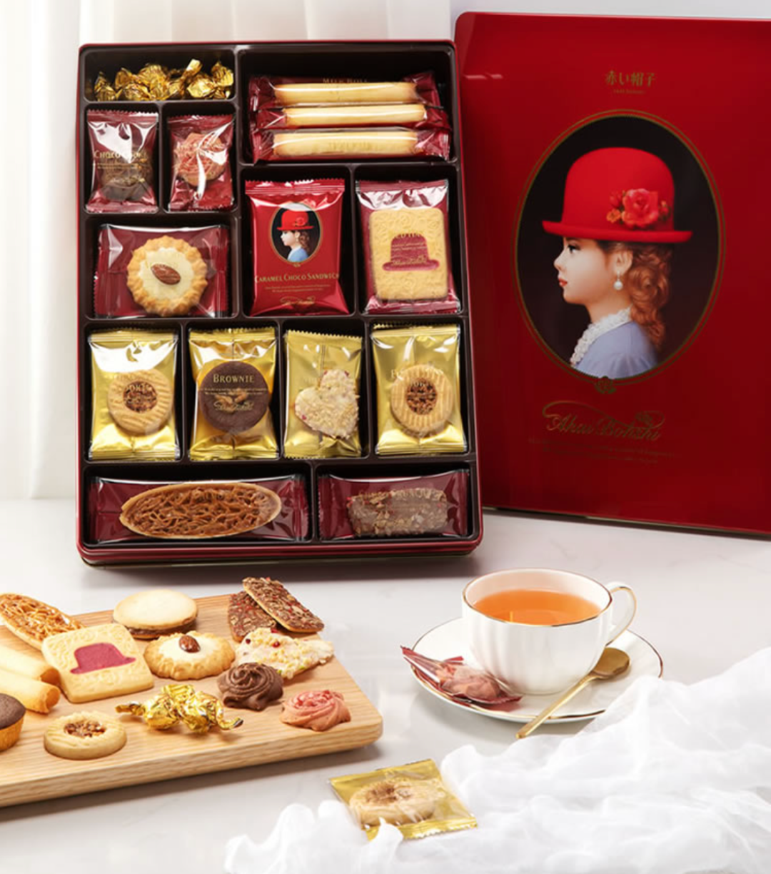 外层是烘烤过的焦香奶皮,内里是超级浓郁的流心芝士。小小一枚,像是浓缩了一整块芝士蛋糕。放在舌尖任它融化,你会体验到什么叫曼妙!每次过节去高级超市,都会看到这个红帽子女孩的礼盒被摆在正C位。没办法呀,这饼干确实从内到外就散发着「高级」两个字。这款饼干礼盒来自日本知名品牌TIVOLI,属于高端饼点,日本人会将它作为节日贺礼或婚庆伴手礼。所有原料都采用最高级的标准,干果类从美国、澳大利亚、意大利等地进口,巧克力来自卢森堡,红茶来自斯里兰卡……一盒饼干里,就汇聚了全球最顶尖的食材。制作工艺由日本首位获得德国西点Meister称号的大师把关,去除了欧美西点重油重糖的传统,添加膳食纤维和益生菌等健康原料,同时也把「和式」风味带入了西点中。前阵子同事发喜糖,里面就放了这款Roca扁桃仁太妃糖,很受办公室小伙伴们喜爱。