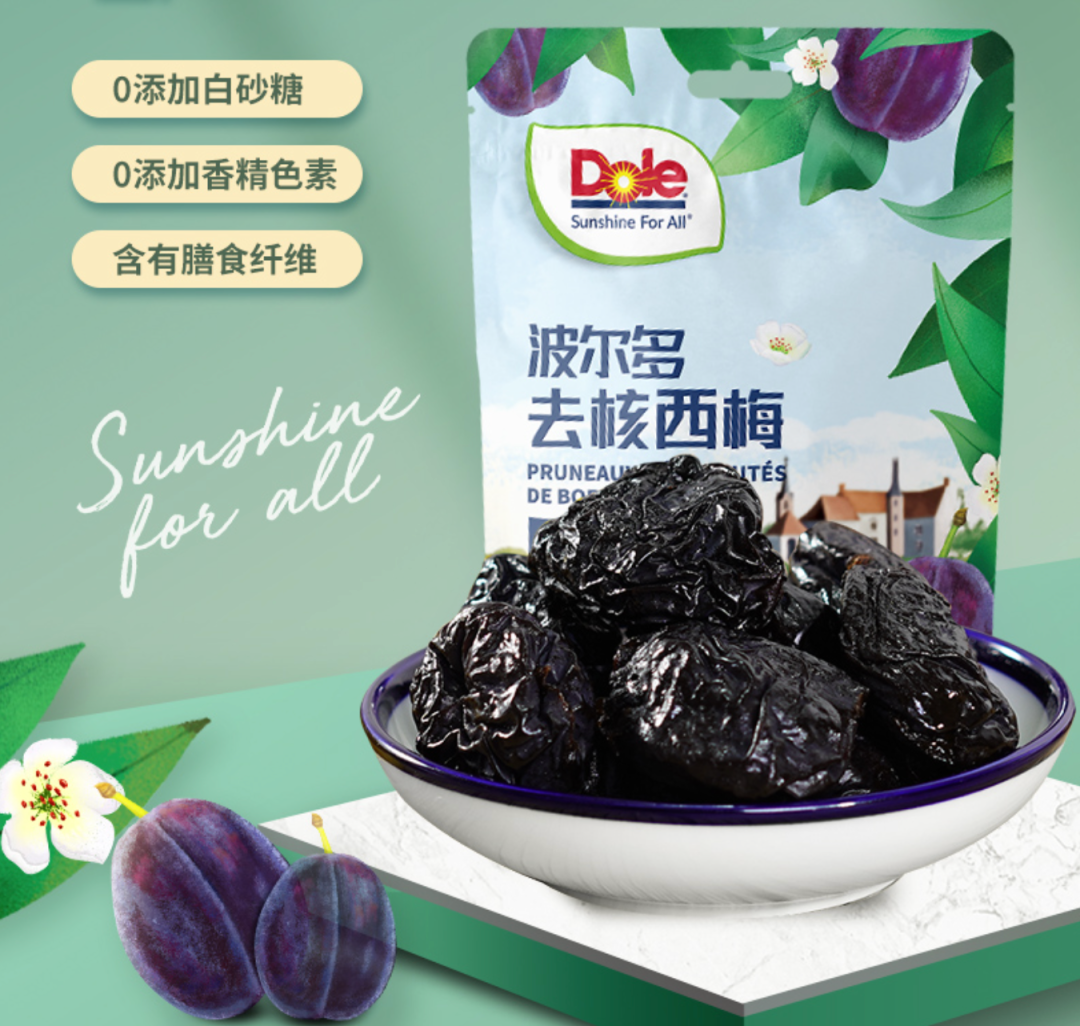 西梅拥有丰富的膳食纤维,可以给过节超负荷的肠道增加一些肠动力。同时富含铁、维生素A和C,对人体铁质摄取、皮肤和头发的保养都有帮助。都乐的这款西梅干,原材料来自法国著名的红酒产区波尔多。那里阳光充足,气候适宜,出产的西梅个大核小,汁水饱满,膳食纤维含量也更高。100g就有3.8g膳食纤维,一包即可满足人体每日所需膳食纤维的20%。