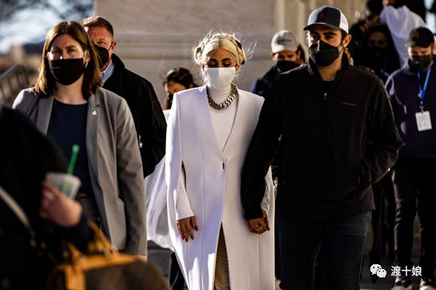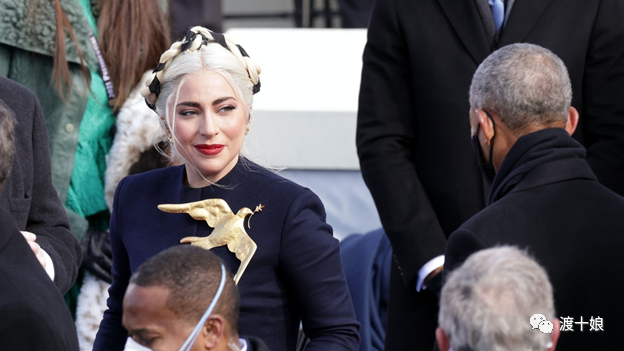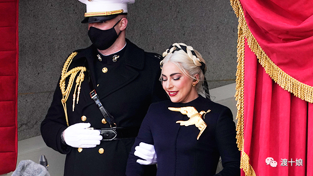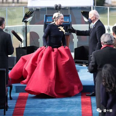 再来看今天唱国歌的Lady Gaga,今天的场合,需要穿保守,可是也要美,嘎嘎今天这身,也算非常得体又非常美。大红裙太扎眼了,十分怀疑下面是巨高的高跟鞋,第一她最爱那些高得无法驾驭的高跟鞋,而且她今天好像不被扶着就要摔倒的架势。