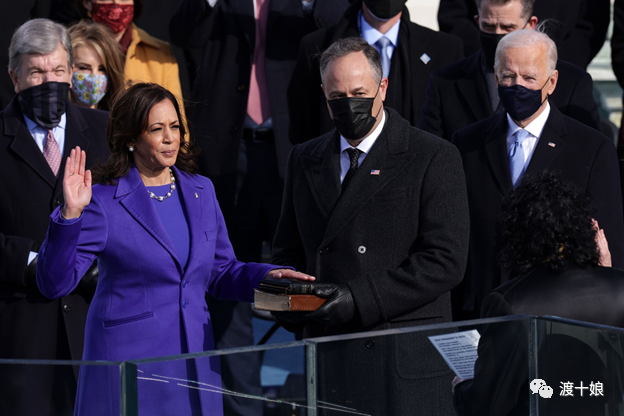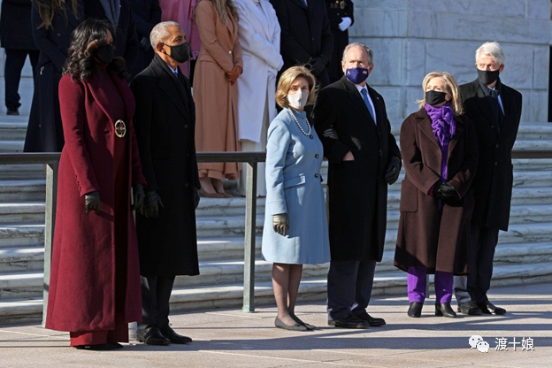 再来看新上任的副总统。今天一身紫色,招牌珍珠项链耳环。话说这身大衣稍微有点太长。里面裙子倒是刚刚好的长度。副总统不高,这个长度的大衣要穿好看,还是需要腰细一些。发型也是仔细吹过卷过,一定还喷了不少发胶,因为外面风太大了。不过一身穿着也同样是不抢镜。她穿着打扮上一直走安全路线。之前我专门写过一篇她的时尚穿搭,大家有兴趣可以翻来看。