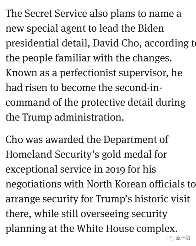 木然老师辛苦人肉出了这个特勤,人家果然不是华人,是韩裔,David Cho,川时代他也是特勤二总管,川去北韩,安全是他负责,因此得了奖。他做了19年特勤,声誉一流,完美主义者,受到大家尊重。