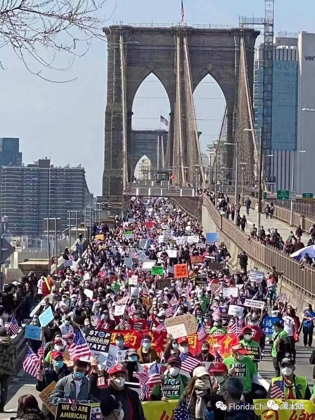 4月4日纽约几万人游行队伍通过布鲁克林大桥(图片来源 网络)
