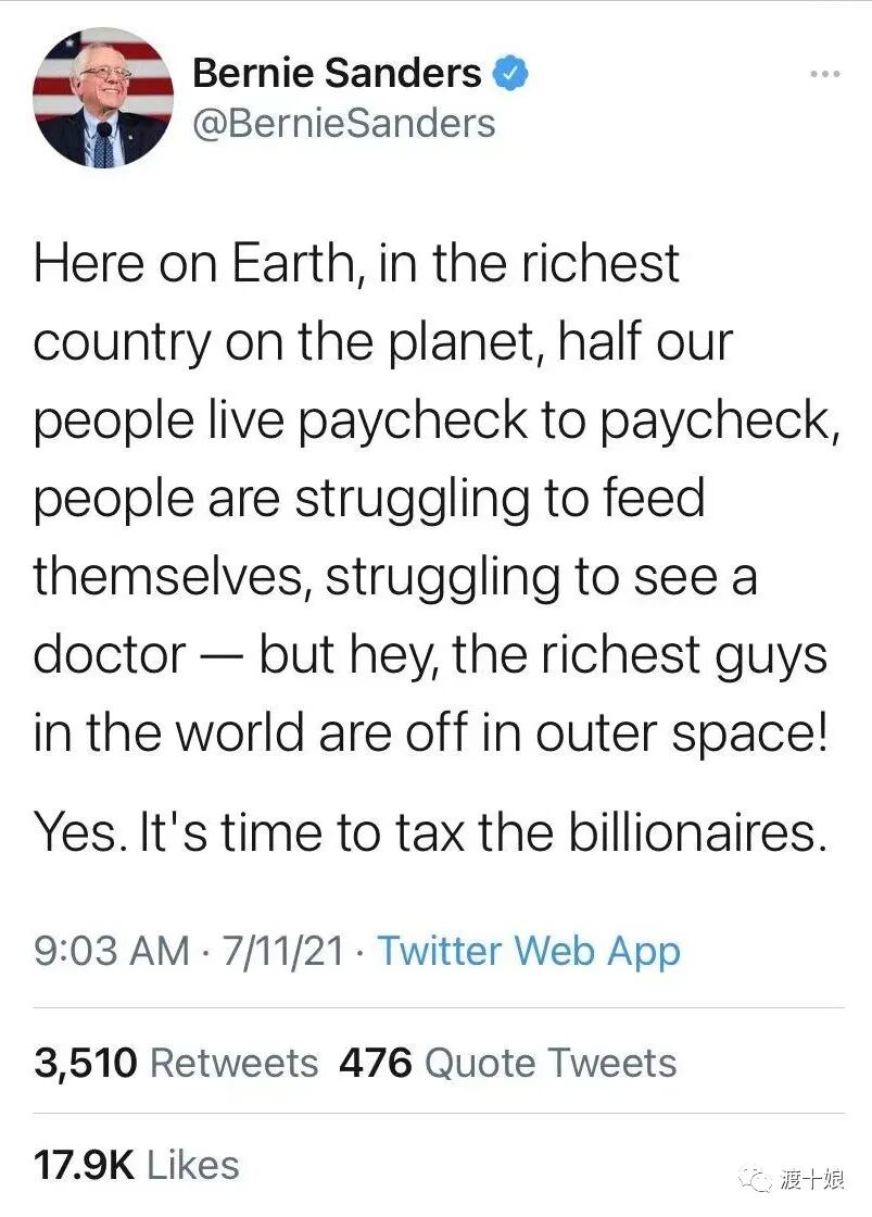 当然,对于首富们争相奔向太空,也有不同声音:桑德斯老头儿就这么说,是时候要向这些亿万富翁收太空税啦