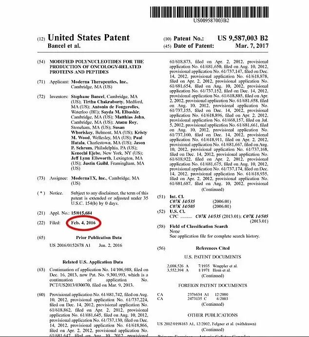 记录显示,Moderna于2016年2月提交了这项专利,作为其癌症研究部门的一部分。该专利序列是一个名为MSH3的基因的一部分,该基因已知会影响体内受损细胞的自我修复方式。它于次年3月7日被批准。