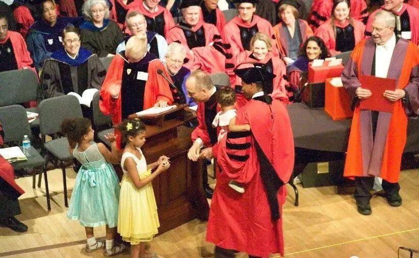 毕业生领取学位证书,是在哈佛大学各个学院的会场。儿子所在的文理学院毕业生集中在哈佛大学纪念大楼里的剧场,首先颁发的是硕士学位,然后再颁发博士学位。我们随着观礼的家长和亲友队伍,站在草地上的白色帐篷里,一边通过校内的闭路电视收看现场的实况录像,一边等候进入会场。在学院一级的学位证书颁发舞台上,坐着来自各个系有名望的教授。当毕业生听到喊自己的名字时,一个接着一个走上台去,接受属于自己的这份荣誉。只见一位男毕业生,怀里抱着、手上牵着、后面跟着一共三个孩子,前呼后拥地登上舞台,全场立刻响起热烈的掌声。在哈佛,每年的毕业典礼上都可以看到这个情景。似乎已经形成一个约定俗成的规矩,如果学位获得者已经有了儿女,无论孩子多少岁,都可以把他们带上台去一起领取学位证书。我心想,这些孩子将来应该都是哈佛大学的新一代吧?很少有人会向他们一样在嗷嗷待哺的年纪,就已经接受了哈佛大学毕业典礼的洗礼。