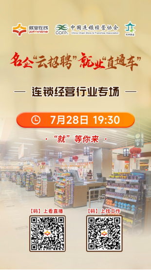7月28日19:30分,“就业在线”携手中国连锁经营协会为广大求职者带来“名企云招聘 就业直通车”直播带岗活动——连锁经营行业专场。此次直播涉及百货、超市、酒店、零售等多种岗位等你来挑!本次连锁经营行业专场特邀如家酒店管理有限公司、银泰百货有限公司、来伊份股份有限公司、山东六燊商贸集团有限公司、北京超市发连锁股份有限公司五家企业,为广大求职者提供近1800个岗位,包括产品企划、管培生、会计、烘焙师、零售品牌经理、收银员、理货员等。