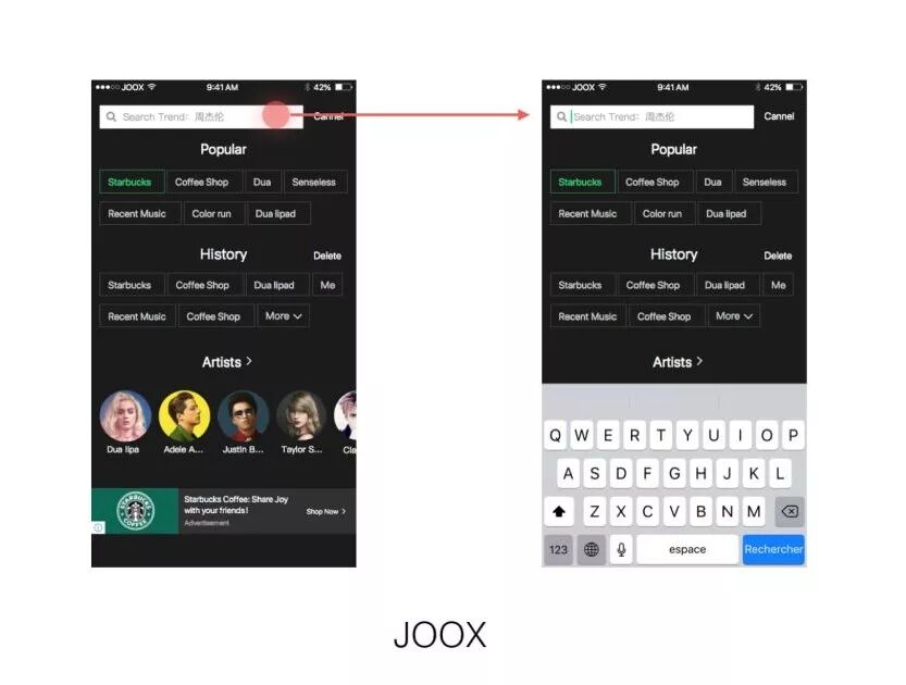 不过还有一个地方可以放,那就是第一次拉起的推荐页。具体如何选择也要看具体内容。JOOX选择放在这个页面。这样做的原因和好处在于真实的用户数据进入推荐页的用户一多半都是进行点击历史记录操作,放在第一个页面无疑缩短了用户重复搜索的路径,提高了效率。