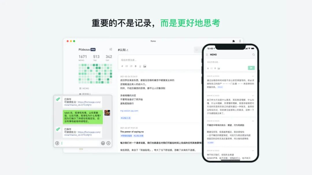 Flomo 是一款非常轻量的笔记工具,用类似发微博的方式快速记录一些知识片段。相比 Eagle 用于“剪藏”已有的内容,Flomo 更注重主动创造和记录。产品的功能目前非常简单,但背后的「卡片笔记法」理念很有意思,提倡先快速积累卡片,然后通过标签和关联让结构涌现,积累知识的复利。感兴趣的朋友可以了解他们对于“知识管理”的思考。