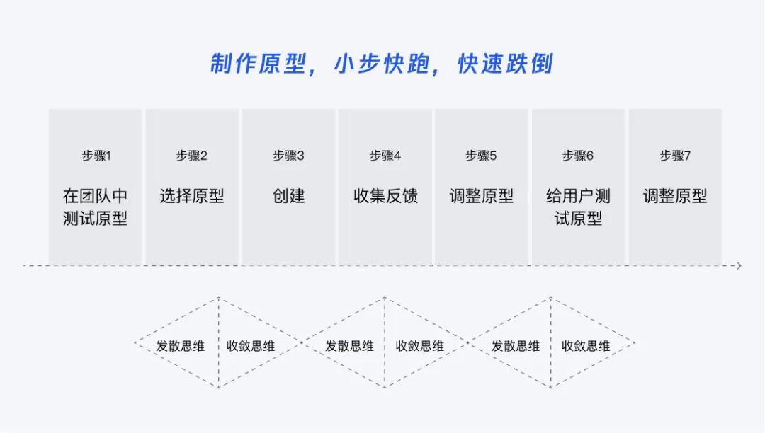 交互上可以用一些原型沟通和演示,视觉上可以使用一些草图或色卡来理解感受, 泡沫板粘贴的实体产品原型也可以满足沟通。在原型测试阶段重复发散、收敛的过程,最终让好的创意落地,整体可以分作三个阶段: