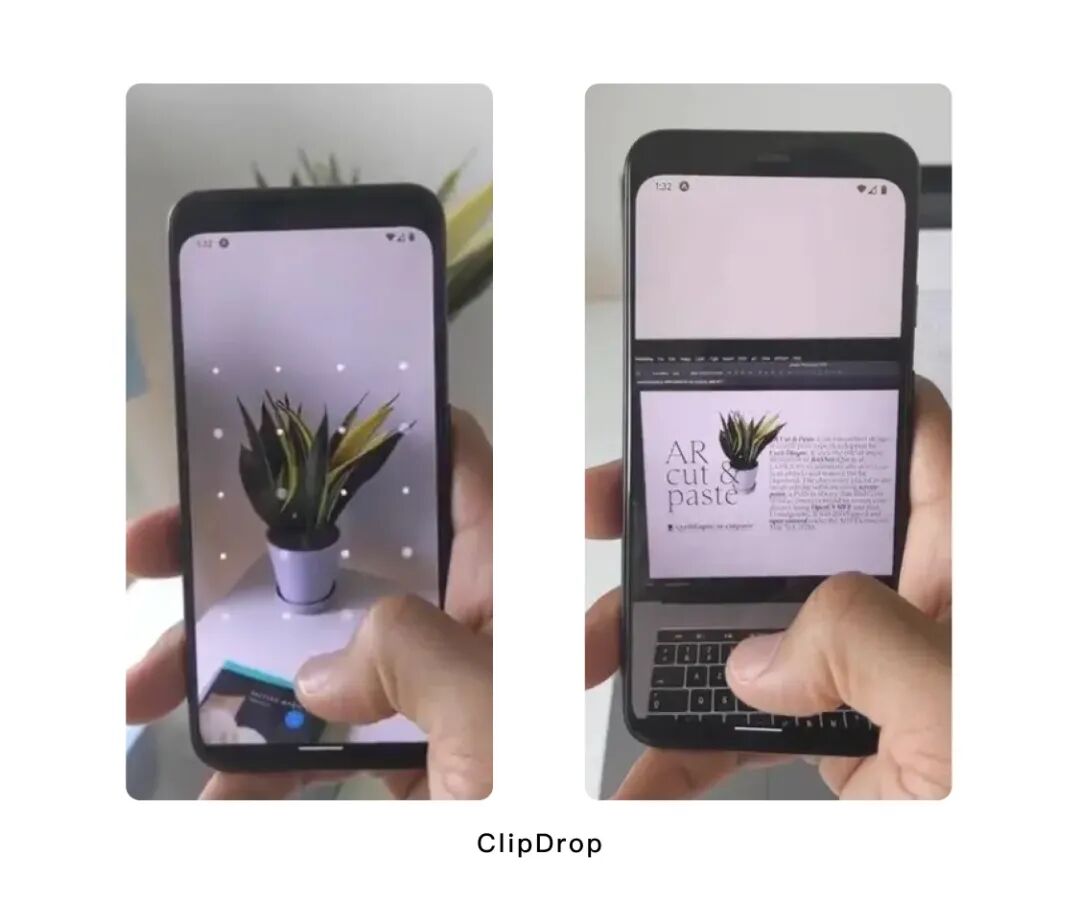 我们小时候应该都做过剪贴报。而在生活中我们也想把真实世界中的物品剪切放置到文件或情绪板内。ClipDrop支持在手机端拍摄实物,自动扣除背景将物件提取出来,当用户把手机移动到电脑端前,真实世界中的物品就会迅速“复制粘贴”到面板上。