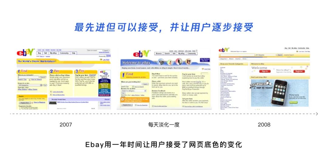 早期他们的官网使用黄色作为文字的底色,阅读起来并不够友好。他们在品牌升级时将文字底色改为白色,却没想到这个在现在几乎是共识的决定遭到了成千上万的邮件质问原因,并要求网页改回黄色。很显然,用户没有准备好改变,于是Ebay选择将网站改回了黄色,并用一年中每天将黄色调低一级,直到一年后完全白色时,已没有任何用户抱怨。所以,在设计和改变时不用追求一蹴而就,尊重用户的节奏调整更容易让创新被接纳。