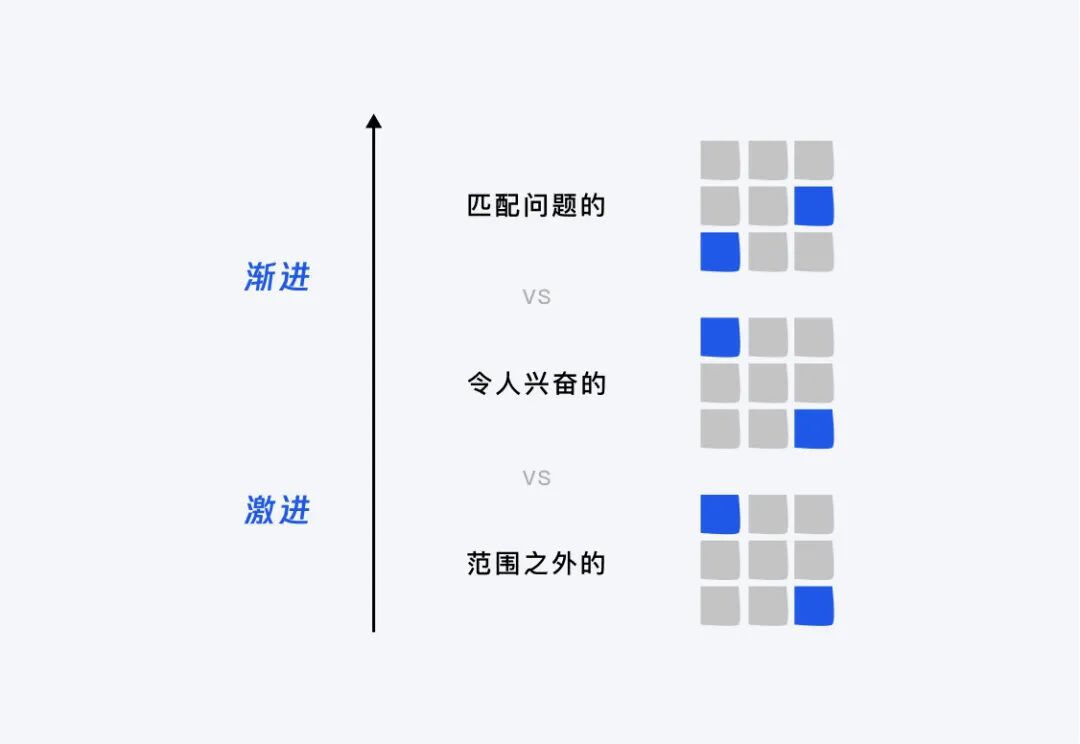 下图方法可以快速区分出匹配和创新程度。在创意过程中,我们发散的想法可能会超越最初定下的渐进范畴,此时可以重新审视发散的想法是属于渐变式创新还是激进式创新,先匹配当下需求,其他范围之外的考虑之后投入更多资源实施。
