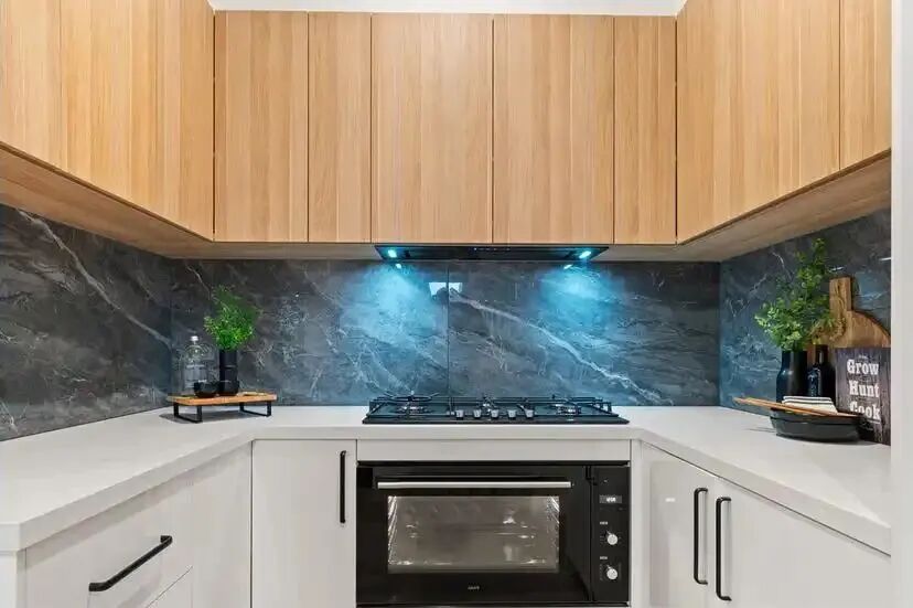 视线转移,现代开放式厨房来到人们眼前。独特的双色调橱柜来自设计师的巧思,木色与白色的搭配显得自然而生动。此外,厨房区域安装有一系列黑色欧式家电——其中包括配有5燃烧器的900mm燃气灶台和电动多功能烤箱。用餐区沿袭了这一住宅简约大方的特点,木制长桌搭配编织木椅,营造出轻松自在的氛围。还需要提到的是,厨房还能通往设备齐全的洗衣房,洗衣房中配有额外储藏室、水槽和通往外部的滑动门。