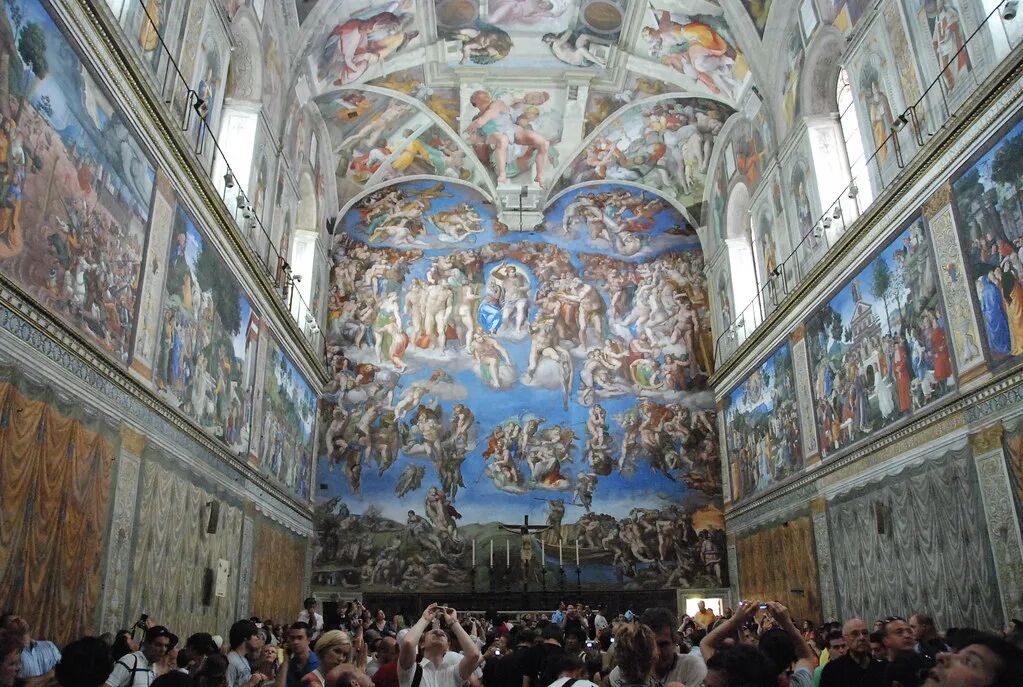 墙上的壁画取《旧约·圣经》为题材,正面是《最后的审判》,右侧是《基督传》,左侧以《摩西传》为主题。天花板的中央是《旧约·圣经》的创世纪,画有预言者、巫女的像。最精彩是《创造亚当》、《原罪与流放乐园》、《诺亚方舟》。