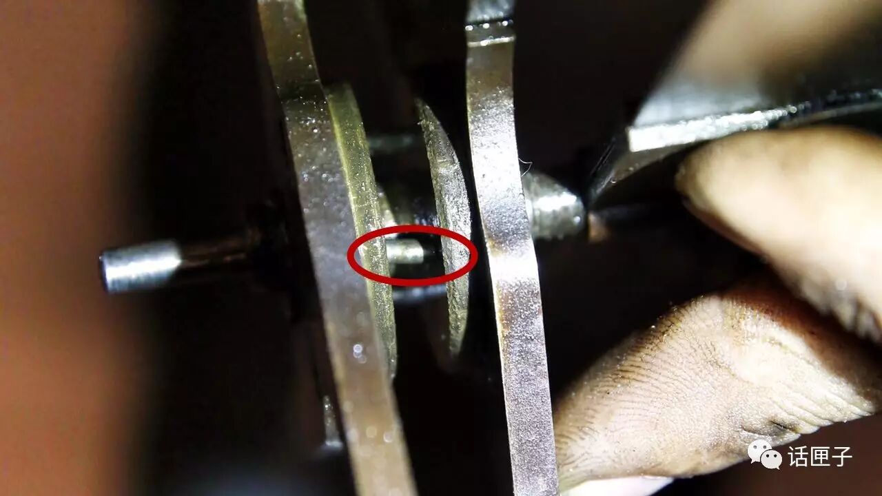 细观这个换下来的旧“擒纵轮”,有一个轮销断了,还有一个螺丝也掉了。
