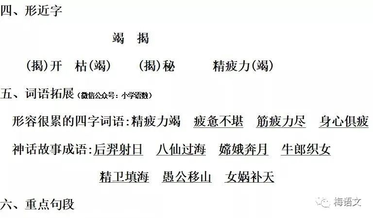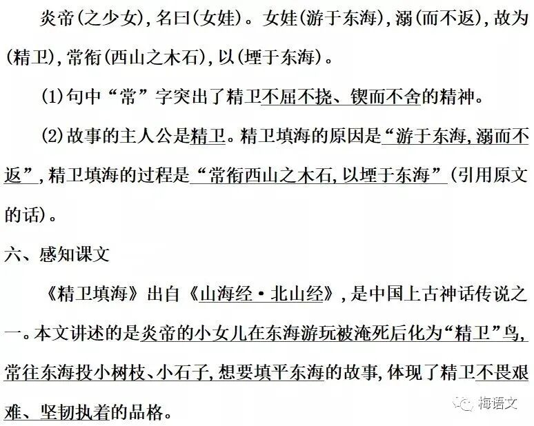 2.《精卫填海》会以填空形式考查课文原文,会以课内阅读形式考查课文内难理解的字词的意思,以及精卫填海表现的精神。