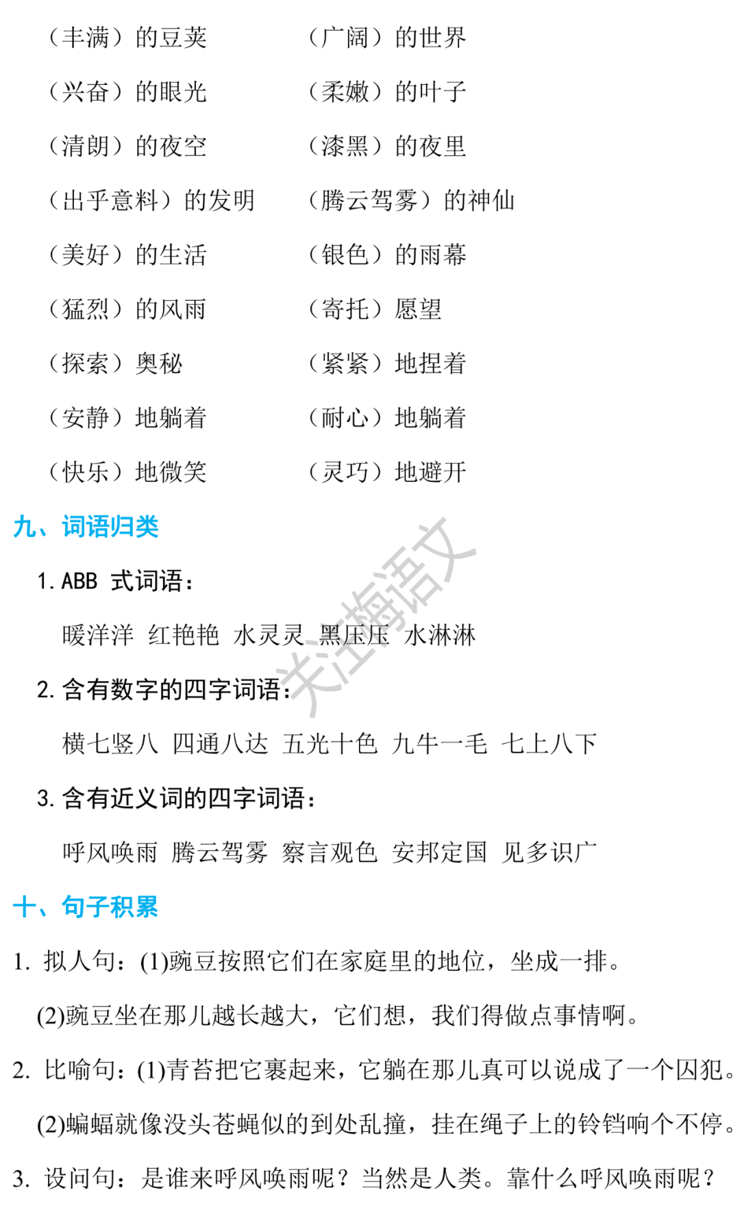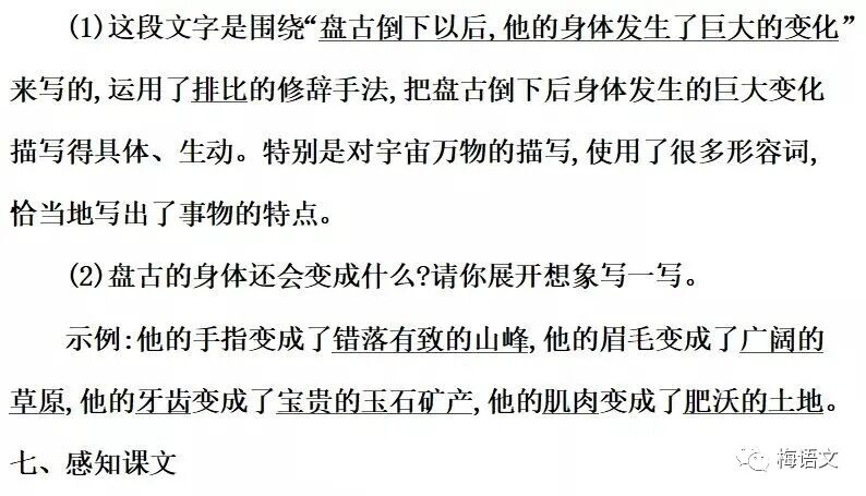 (1)这段文字是围绕“盘古倒下以后,他的身体发生了巨大的变化”这句话来写的,运用了排比的修辞手法,把盘古倒下后身体发生的巨大变化描写得具体、生动。特别是对宇宙万物的描写,使用了很多形容词,恰当地写出了事物的特点。