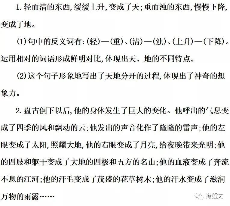 排比句使得文章行文气势极足,同时也让我们感受到了盘古的伟大贡献。