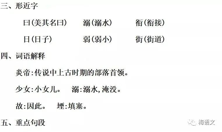 2.《精卫填海》选自《山海经·北山经》,讲述了炎帝的小女儿女娃去东海游玩时,不幸溺水,化为精卫鸟,衔来西山木石填塞东海的故事,塑造了坚韧、执着的精卫形象。