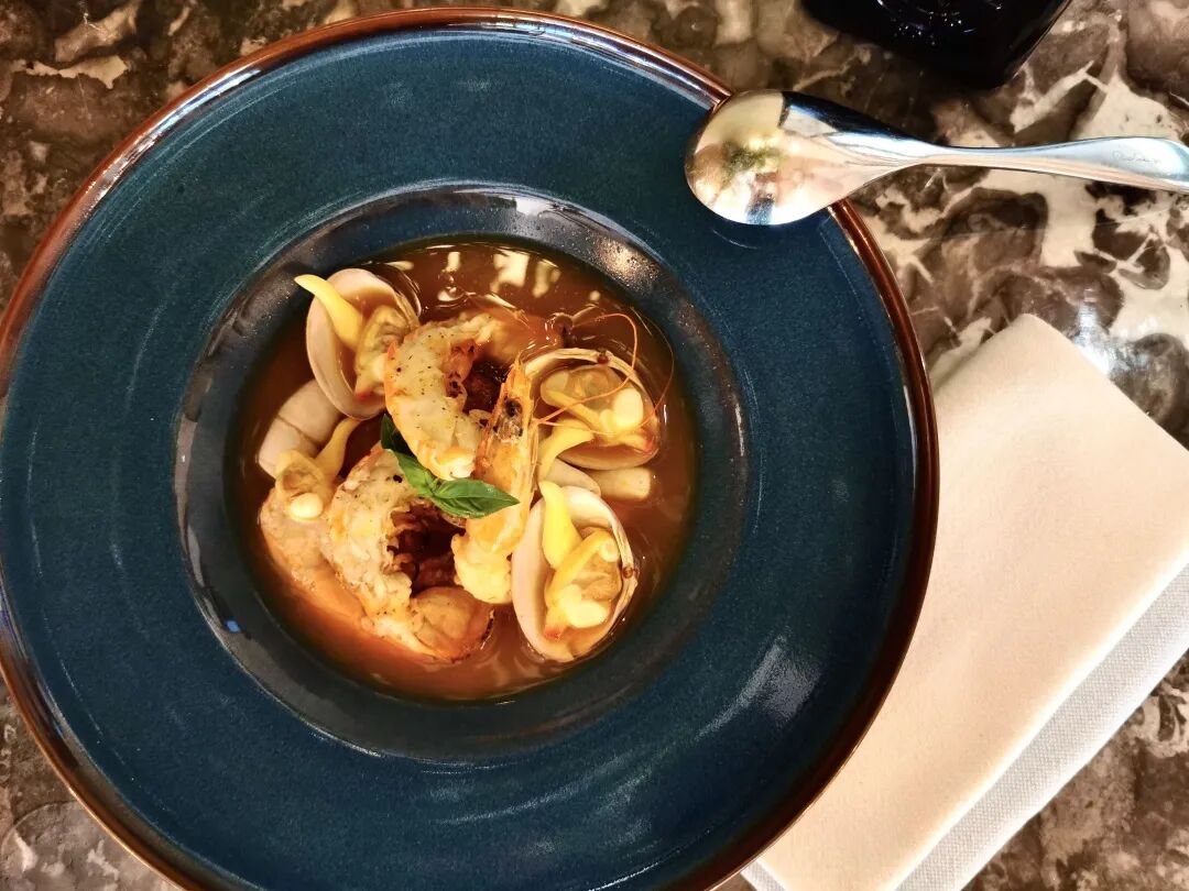 带壳海鲜汤,烤甜椒配酸面包