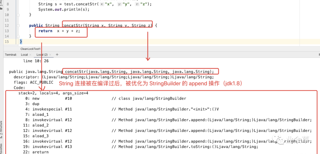 这里大家可能会担心 StringBuilder 不是线程安全的的操作会存在线程安全的问题吗?这里的答案是不会,x + y + z 操作的优化「经过逃逸分析」过后,他的动态作用域被限制在了 concatStr方法内,就是说当前实际执行的 StringBuilder 的操作在 concatStr 方法内部,「其他的外部线程无法访问」到,所以这里「虽然有锁,但是可以被安全的消除掉。所以当我们进行编译过后,这段代码就会忽略掉所有的同步措施直接执行。」