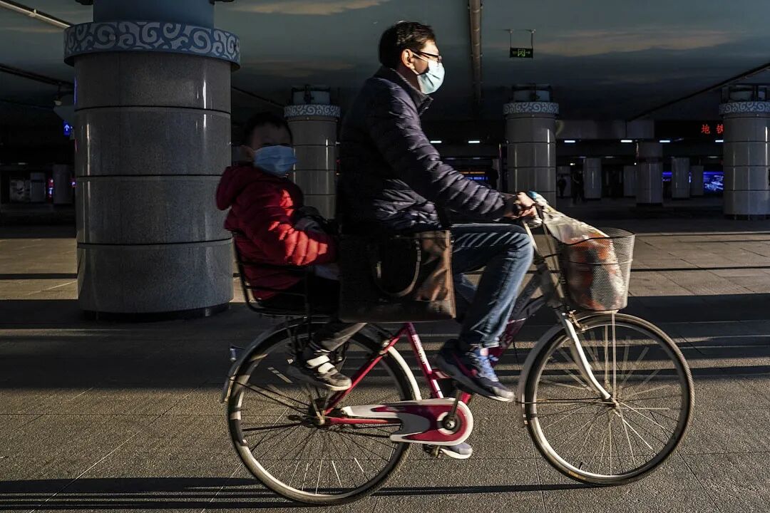 ▲2020年3月27日,一个男子与孩子在街上骑著自行车。摄:Lintao Zhang/Getty Images