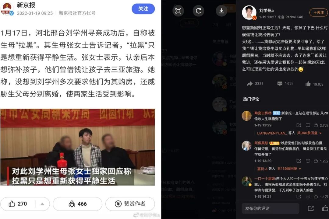 在承认这些新闻操作失当的前提下,我依然不认为《新京报》应该承担“杀人者”的罪名。相反,普通网民、营销号等高打高举地批评《新京报》已经演变为了新一轮的网络暴力,颇有一种“唾沫星子要淹死无良媒体”的架势。事实上,少有人用心发现,刘学州在抖音视频中的另一则更糟糕的文章实际上是“新浪综合报导”摘取自《红星新闻》的内容。后者是成都传媒集团成都商报旗下的“新媒体项目”。这一篇文章的正文像罗生门一样,先从刘学州的角度叙述一遍“给我一个家”,再从生父生母的口中说“他依然坚持要求生父母为他买房”。从正文的角度,它甚至也是所谓“机械式平衡的”,但真正重要的是,在微博app里,它是嵌入的热门文章,点击后需要跳转新浪新闻的app才能阅读全文,否则只能看到标题本身《寻亲男孩要求生父母买房被指白眼狼生父首发声》和文章开头一小部分。普通人甚至无法判断这样的标题是新浪摘编写的,还是红星写的。