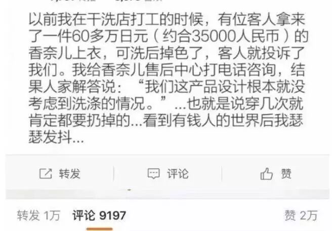 这一年,香奈儿火了,35000元的上衣洗一次就掉色,你心疼,但别人却告诉你“我们的产品根本就没有考虑过洗涤的情况。”