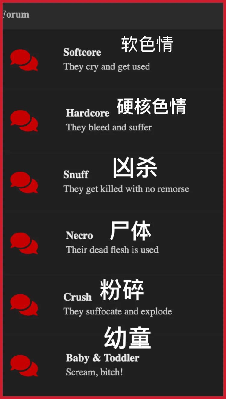 虐鸡,黑话叫 Fucking Chicken crush (xx鸡并虐杀)网站主打的卖点,是儿童“投稿区”——Baby &Toddler(婴幼儿),用户们可以在里面投稿、观看相关的虐童视频,更为渗人的是,里面还有虐婴视频,与婴儿xx。由于其中的内容实在太过于残酷,所以我们也不会放任何相关图片出来。当然,视频的质量是有着严格规定的,只有对儿童极尽残酷虐待的视频才能过审。