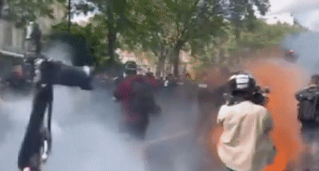 示威游行的场面也十分骇人,身穿防暴服的警方与示威者发生了激烈的混战,现场到处是烟雾弹和催泪弹,法国警方还动用了高压水枪以驱散人群……