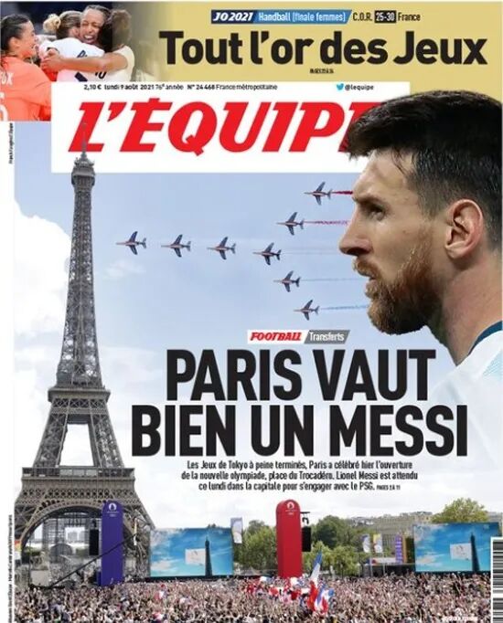 消息传出当天,不少法国媒体在报道巴黎即将接过奥运接力棒的同时,将头版留给了梅西。