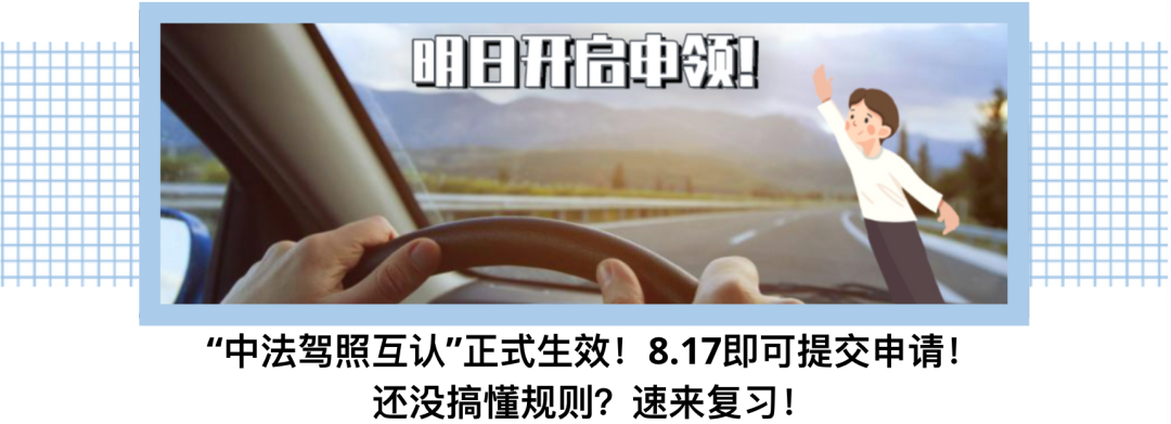 各位小伙伴们大家好!本周一,小编向大家传递了一则好消息——《中法驾照互认换领协议》8月17日起终于正式生效啦!(戳链接回顾:“中法驾照互认”正式生效!8.17即可提交申请!还没搞懂规则?速来复习!)